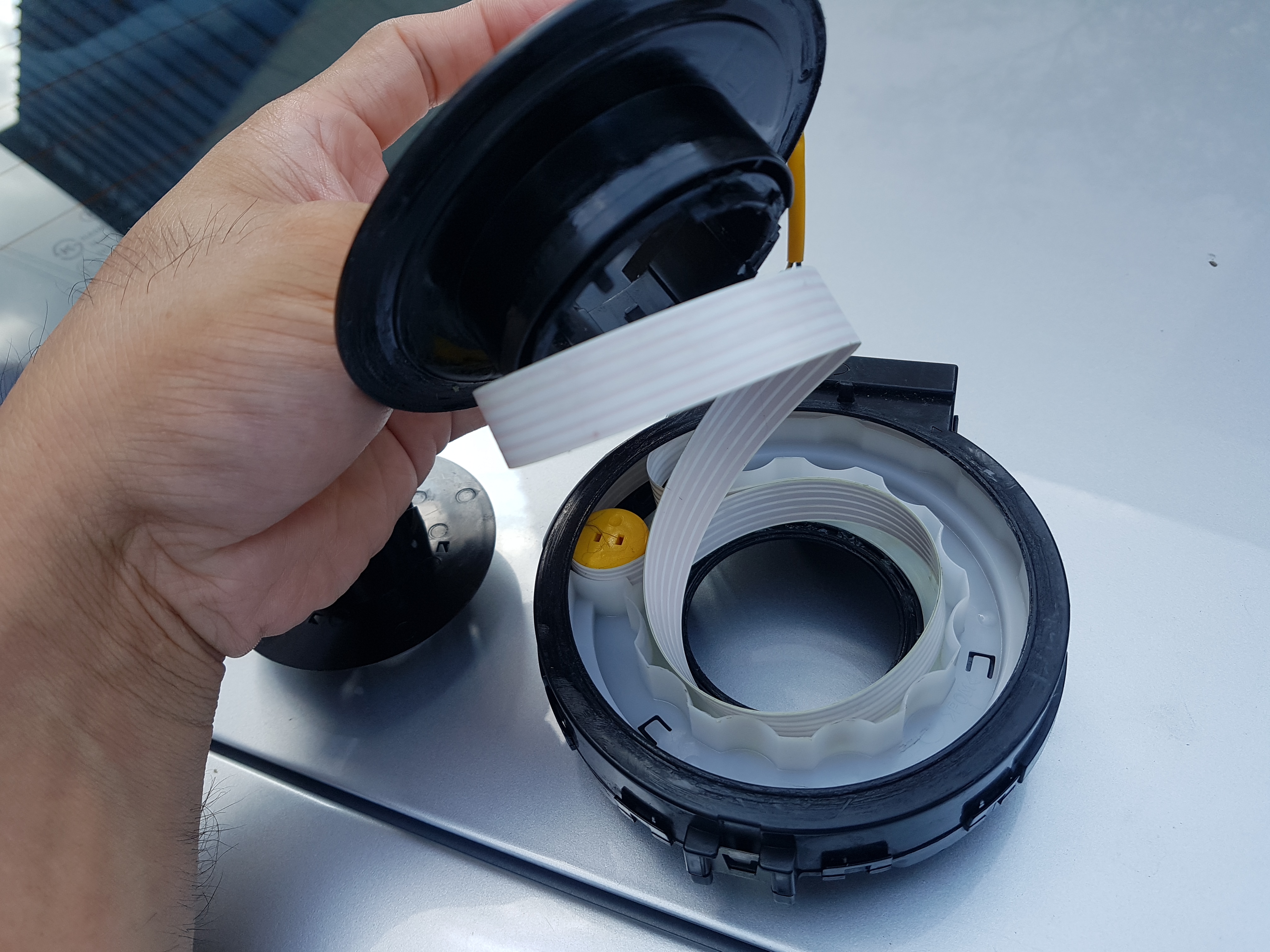 FFC 케이블을 이용해서 어느정도(자동차는 좌/우 2.5바퀴 핸들이 돌수 있어야 하니) 회전을 하면서