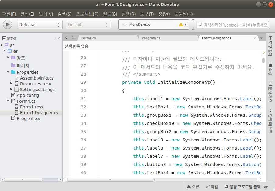 더블 클릭해서 실행하니 mono develop 가 뜨고 빌드 옵션을 Debug에서 Release로 바꾸고