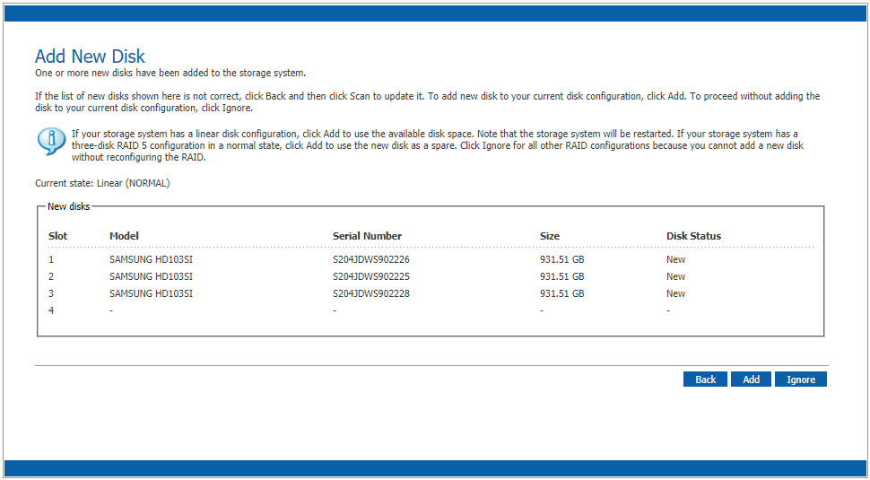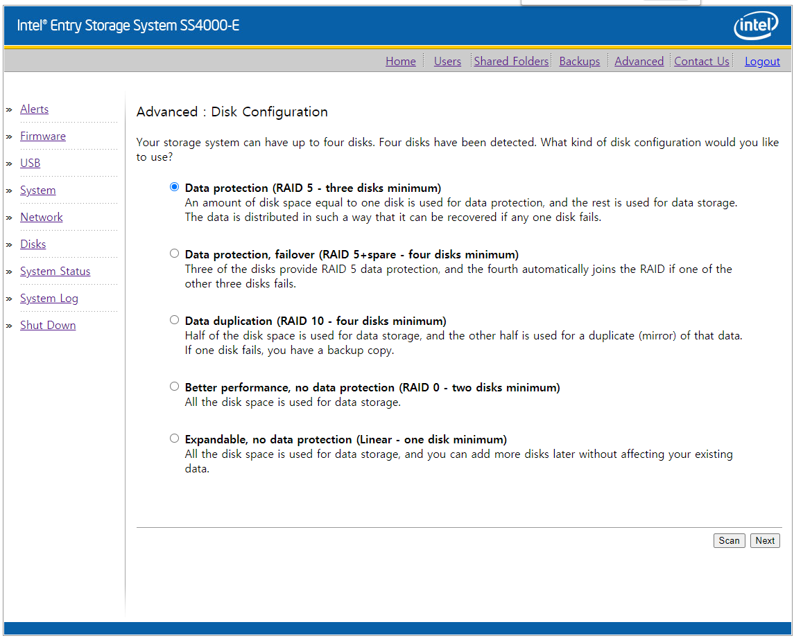 RAID5 3+1 / RAID5 4 / RAID 10 / RAID 0 / JBOD 로 설정이 가능하다.