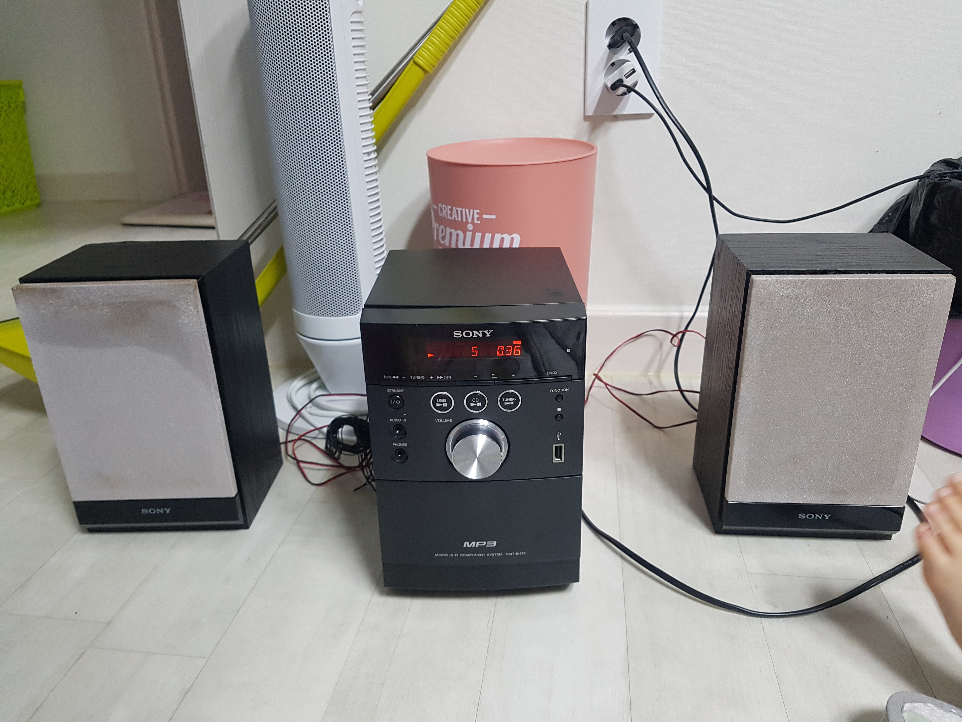 그런데 티비 옆으로 옮기니 안나온다. 본체 위에 핸드폰 올려놨더니 FM이 잘 안잡히던데 옆에 공유기 있어서 그런가?