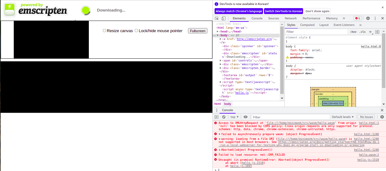 | $ emcc emcc: error: no input files $ cat hello.c #include <stdio.h> int main() { printf("hello, world!\n"); return 0; } $ emcc -o hello.js hello.c $ ls -al 합계 148 drwxrwxr-x 2 minimonk minimonk 4096 10월 25 15:40 . drwxrwxr-x 8 minimonk minimonk 4096 10월 25 15:39 .. -rw-rw-r-- 1 minimonk minimonk 76 10월 25 15:39 hello.c -rw-rw-r-- 1 minimonk minimonk 126915 10월 25 15:39 hello.js -rwxrwxr-x 1 minimonk minimonk 11522 10월 25 15:39 hello.wasm $ file * hello.c: C source, ASCII text hello.js: ASCII text, with very long lines hello.wasm: WebAssembly (wasm) binary module version 0x1 (MVP) |