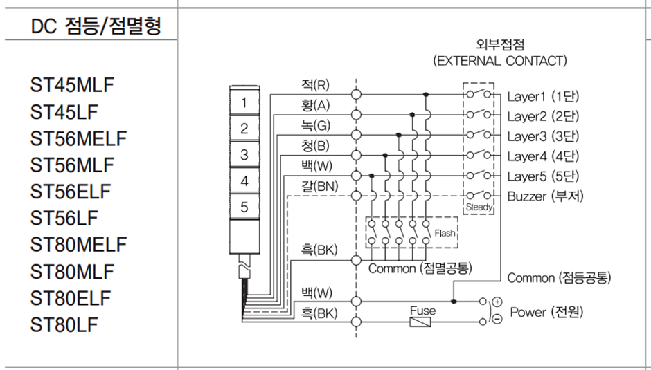 외부접점쪽 적/황/녹/청 은 DC+ 혹은 '흑'과 연결되며