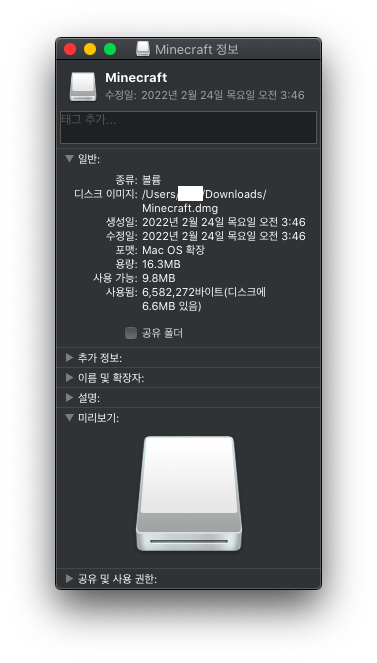 바탕화면에 생긴 Minecraft 디렉토리는 "볼륨" 타입으로 출력된다.