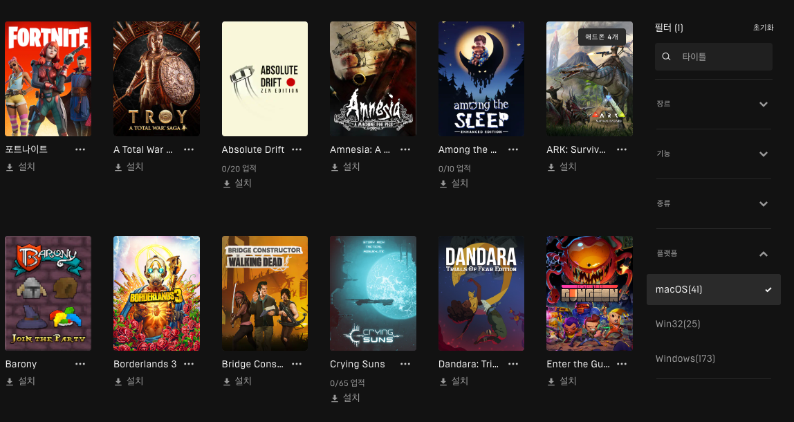 아무튼 그 중 맥에서 되는건 41개. 하지만 맥북에어에서 게임을 하기에는 발열이 너무 걱정되니 보는 용도로만.. ㅠㅠ