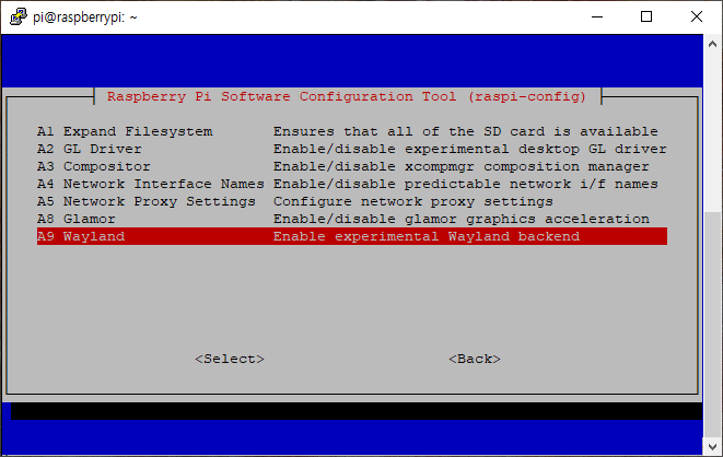 라즈베리 파이 3, 64bit 버전, raspi-config에서 Advanced로 들어가니 A9 Wayland가 존재한다.