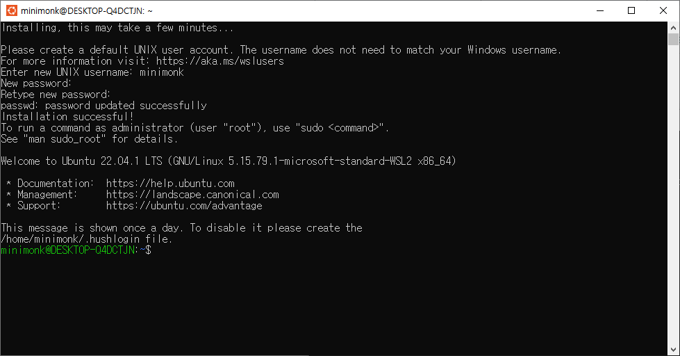 | C:\>wsl To run a command as administrator (user "root"), use "sudo <command>". See "man sudo_root" for details. minimonk@DESKTOP-Q4DCTJN:/mnt/c/Users/free$ |