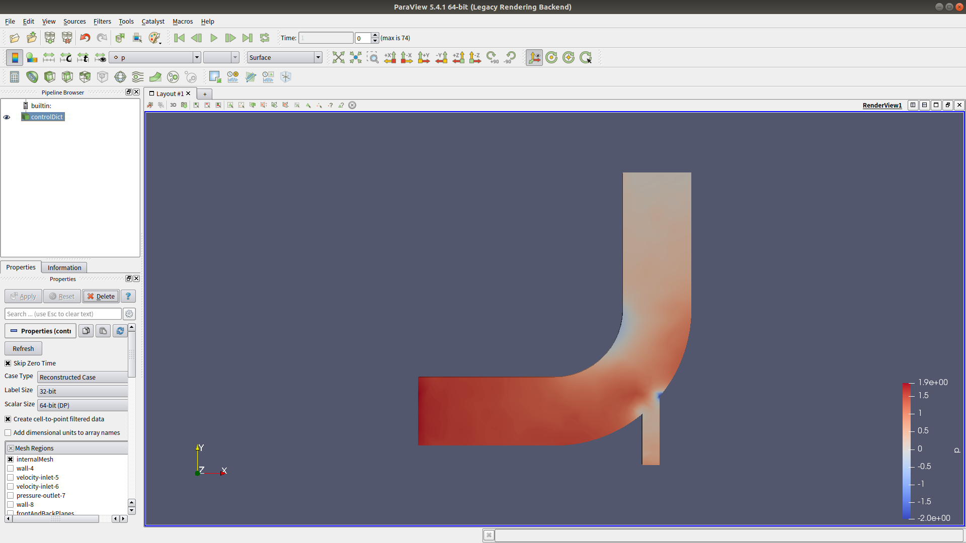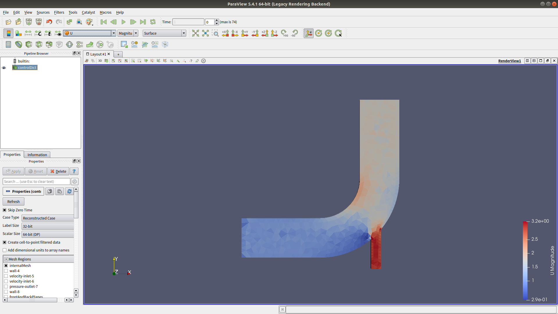 | $ openfoam openfoam = /usr/lib/openfoam/openfoam2212 * Using: OpenFOAM-v2212 (2212) - visit www.openfoam.com * Build: _f8e05934-20230403 (patch=230110) * Arch: label=32;scalar=64 * Platform: linux64GccDPInt32Opt (mpi=sys-openmpi) OpenFOAM shell session - use 'exit' to quit openfoam2212:~/src/tutorials/incompressible/icoFoam/elbow_tri/ minimonk$ fluentMeshToFoam elbow_tri.msh /*---------------------------------------------------------------------------*\ | ========= | | | \\ / F ield | OpenFOAM: The Open Source CFD Toolbox | | \\ / O peration | Version: 2212 | | \\ / A nd | Website: www.openfoam.com | | \\/ M anipulation | | \*---------------------------------------------------------------------------*/ Build : _f8e05934-20230403 OPENFOAM=2212 patch=230110 version=2212 Arch : "LSB;label=32;scalar=64" Exec : fluentMeshToFoam elbow_tri.msh Date : May 24 2023 Time : 17:15:20 Host : mini2760p PID : 24479 I/O : uncollated Case : /home/minimonk/src/tutorials/incompressible/icoFoam/elbow_tri nProcs : 1 trapFpe: Floating point exception trapping enabled (FOAM_SIGFPE). fileModificationChecking : Monitoring run-time modified files using timeStampMaster (fileModificationSkew 5, maxFileModificationPolls 20) allowSystemOperations : Allowing user-supplied system call operations // * * * * * * * * * * * * * * * * * * * * * * * * * * * * * * * * * * * * * // Create time Reading header: "TGrid 2D 2.4.1" Reading header: "PreBFC V4.3" Dimension of grid: 2 Embedded blocks in comment or unknown: ( Embedded blocks in comment or unknown:( Found end of section in unknown:) Embedded blocks in comment or unknown:( Found end of section in unknown:) Found end of section in unknown:) Embedded blocks in comment or unknown: ( Embedded blocks in comment or unknown:( Found end of section in unknown:) Embedded blocks in comment or unknown: ( Found end of section in unknown:) Found end of section in unknown:) Embedded blocks in comment or unknown: ( Embedded blocks in comment or unknown:( Found end of section in unknown:) Found end of section in unknown:) Number of points: 537 number of faces: 1454 Number of cells: 918 Reading points Reading points Reading uniform faces Reading uniform faces Reading uniform faces Reading uniform faces Reading uniform faces Reading uniform faces Tgrid syntax problem: 9 1 396 1 cellGroupZoneID:9 cellGroupStartIndex:1 cellGroupEndIndex:918 cellGroupType:1 Read zone1:3 name:internal-3 patchTypeID:interior Reading zone data Read zone1:4 name:wall-4 patchTypeID:wall Reading zone data Read zone1:5 name:velocity-inlet-5 patchTypeID:velocity-inlet Reading zone data Read zone1:6 name:velocity-inlet-6 patchTypeID:velocity-inlet Reading zone data Read zone1:7 name:pressure-outlet-7 patchTypeID:pressure-outlet Reading zone data Read zone1:8 name:wall-8 patchTypeID:wall Reading zone data Read zone1:9 name:fluid-9 patchTypeID:fluid Reading zone data FINISHED LEXING dimension of grid: 2 Grid is 2-D. Extruding in z-direction by: 1.87548 Creating shapes for 2-D cells Building patch-less mesh...--> FOAM Warning : From Foam::polyMesh::polyMesh(const Foam::IOobject&, Foam::pointField&&, const cellShapeList&, const faceListList&, const wordList&, const wordList&, const Foam::word&, const Foam::word&, const wordList&, bool) in file meshes/polyMesh/polyMeshFromShapeMesh.C at line 645 Found 1990 undefined faces in mesh; adding to default patch defaultFaces done. Building boundary and internal patches. Creating patch 0 for zone: 3 start: 155 end: 1454 type: interior name: internal-3 Creating patch 1 for zone: 4 start: 55 end: 154 type: wall name: wall-4 Creating patch 2 for zone: 5 start: 47 end: 54 type: velocity-inlet name: velocity-inlet-5 Creating patch 3 for zone: 6 start: 43 end: 46 type: velocity-inlet name: velocity-inlet-6 Creating patch 4 for zone: 7 start: 35 end: 42 type: pressure-outlet name: pressure-outlet-7 Creating patch 5 for zone: 8 start: 1 end: 34 type: wall name: wall-8 Creating patch for front and back planes Patch internal-3 is internal to the mesh and is not being added to the boundary. Adding new patch wall-4 of type wall as patch 0 Adding new patch velocity-inlet-5 of type patch as patch 1 Adding new patch velocity-inlet-6 of type patch as patch 2 Adding new patch pressure-outlet-7 of type patch as patch 3 Adding new patch wall-8 of type wall as patch 4 Adding new patch frontAndBackPlanes of type empty as patch 5 Writing mesh... to "constant/polyMesh" done. End openfoam2212:~/src/tutorials/incompressible/icoFoam/elbow_tri/ minimonk$ tree . ├── 0 │ ├── U │ └── p ├── 0.orig │ ├── U │ └── p ├── Allclean ├── Allrun ├── constant │ ├── polyMesh │ │ ├── boundary │ │ ├── cellZones │ │ ├── faceZones │ │ ├── faces │ │ ├── neighbour │ │ ├── owner │ │ ├── pointZones │ │ └── points │ ├── transportProperties │ └── transportProperties.bak ├── elbow_quad.msh ├── elbow_tri.msh └── system ├── controlDict ├── foamDataToFluentDict ├── fvSchemes └── fvSolution 5 directories, 22 files openfoam2212:~/src/tutorials/incompressible/icoFoam/elbow_tri/ minimonk$ ico ico icoReactingMultiphaseInterFoam icoUncoupledKinematicParcelFoam iconv icoFoam icoUncoupledKinematicParcelDyMFoam icontopbm iconvconfig openfoam2212:~/src/tutorials/incompressible/icoFoam/elbow_tri/ minimonk$ icoFoam /*---------------------------------------------------------------------------*\ | ========= | | | \\ / F ield | OpenFOAM: The Open Source CFD Toolbox | | \\ / O peration | Version: 2212 | | \\ / A nd | Website: www.openfoam.com | | \\/ M anipulation | | \*---------------------------------------------------------------------------*/ Build : _f8e05934-20230403 OPENFOAM=2212 patch=230110 version=2212 Arch : "LSB;label=32;scalar=64" Exec : icoFoam Date : May 24 2023 Time : 17:19:48 Host : mini2760p PID : 24543 I/O : uncollated Case : /ho