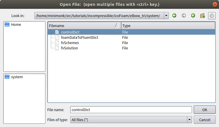 2. elbow_tri/system 디렉토리에서 파일을 모든 유형으로 선택하고 controlDict를 연다.