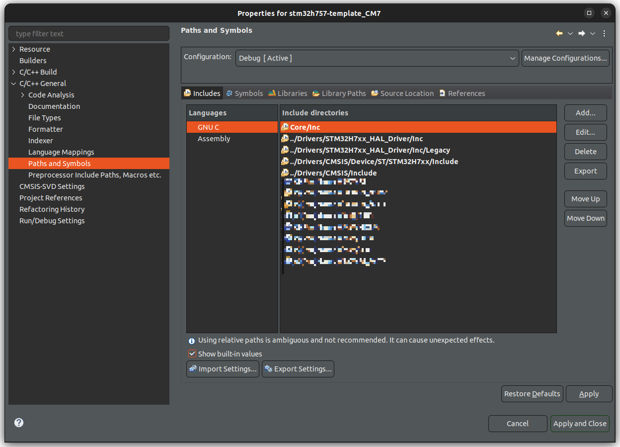 includes 탭은 include 파일/디렉토리를 추가하고
