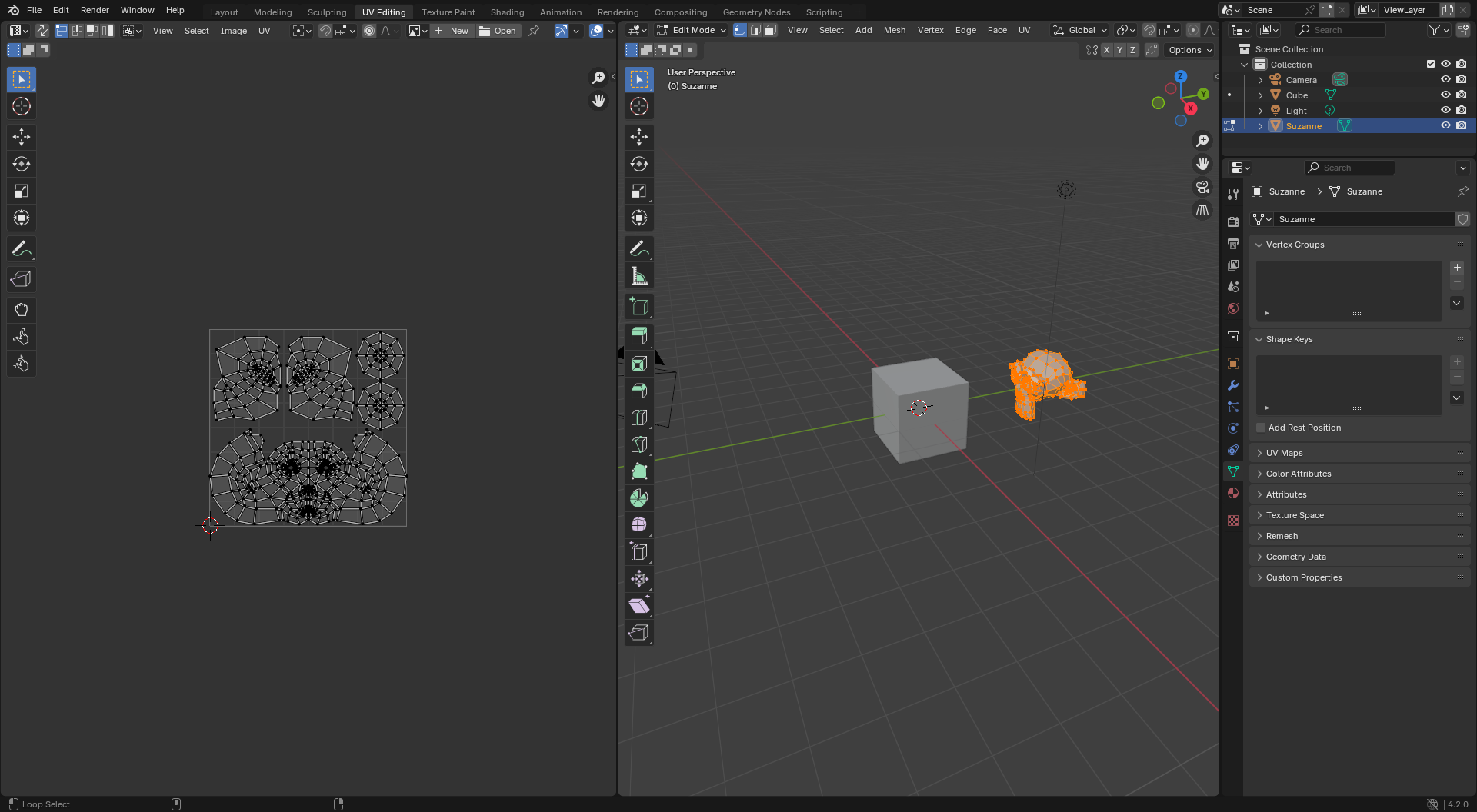 상단 메뉴에 UV editing 을 누르면 바로 전개도가 나온다. 신기하네