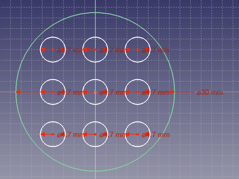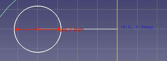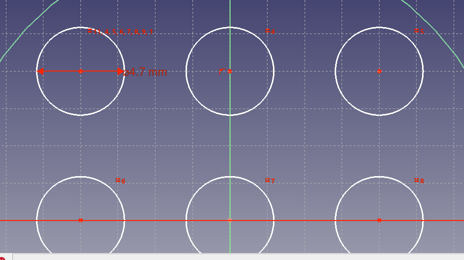 원 아이콘 누르고 8mm 간격으로 있다고 하니 2mm grid 에서 중앙에서 왼쪽으로 4칸, 위로 4칸 해서 적당히 원을 그리고