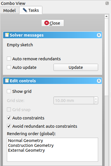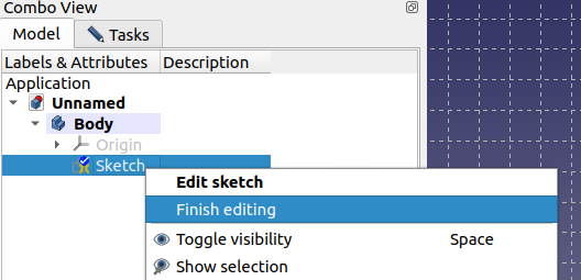 combo view - model - sketch 우클릭해서 Finish editing을 해주면된다.
