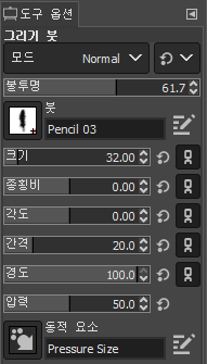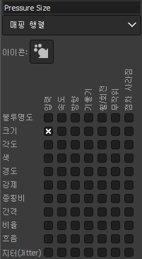 pressure size를 선택하면 매핑 행렬에 크기 - 압력 으로 체크되고, 세게 누르면 두껍게 입력된다.