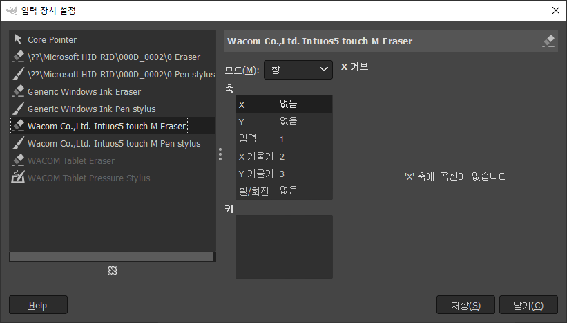 입력 장치에서 WACOM Tablet Eraser와 WACOM Tablet Pressure Stylus의 모드가