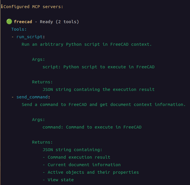 | ~/.gemini$ cat settings.json { "theme": "Atom One", "selectedAuthType": "oauth-personal", "mcpServers": { "freecad": { "command": "/usr/bin/python3", "args": [ "/home/user/.FreeCAD/Mod/freecad_mcp/src/freecad_bridge.py" ] } } } |