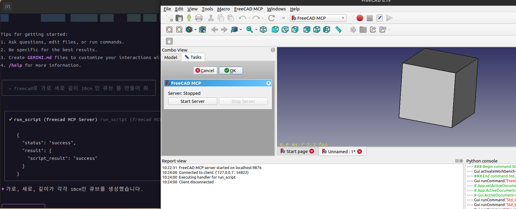 메뉴에서 FreeCAD MCP - Show FreeCAD MCP Panel 누르면 Tasks에 창이 열리는데 Start Server 눌러준다.