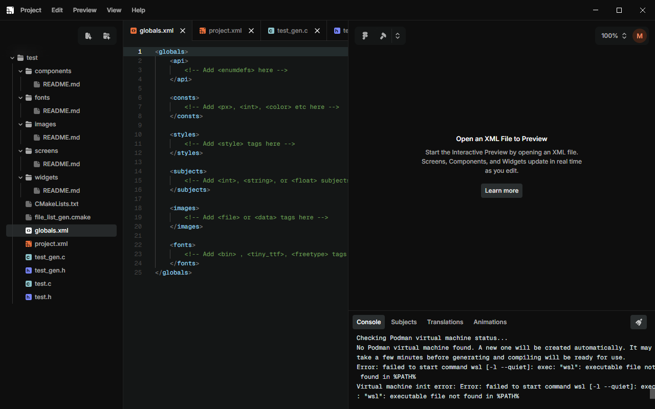| Console Ready ⚠️ Deleted preview-build and preview-bin because they were built with an older version of LVGL. Runtime not found in project, building... Failed to read file C:\Users\minimonk\Desktop\lvgl\test\preview-bin\lved-runtime.js. Generating code for project: C:/Users/shin/Desktop/lvgl/test ⏳ Generating code... Cleaning generated files... Validating code... LVGLSchemaService: loading schemas... Found 2 XML files. Code Validation passed Generating C code: ☑️ Generated test_gen.h ☑️ Generated test_gen.c ☑️ Generated test.c ☑️ Generated test.h [Resource Converter] Mirror docker.io/lvglio/emscripten-sdl2:0.2.0 unavailable: Cannot connect to Podman. Please verify your connection to the Linux system using `podman system connection list`, or try `podman machine init` and `podman machine start` to manage a new Linux VM Error: unable to connect to Podman socket: Get "http://d/v5.5.1/libpod/_ping": dial unix /run/podman/podman.sock: connect: A socket operation encountered a dead network. Mirror ghcr.io/lvgl/emscripten-sdl2:0.2.0 unavailable: Cannot connect to Podman. Please verify your connection to the Linux system using `podman system connection list`, or try `podman machine init` and `podman machine start` to manage a new Linux VM Error: unable to connect to Podman socket: Get "http://d/v5.5.1/libpod/_ping": dial unix /run/podman/podman.sock: connect: A socket operation encountered a dead network. Falling back to local image reference emscripten-sdl2:0.2.0 ✅ Code generated successfully Compiling project Failed to read file C:\Users\minimonk\Desktop\lvgl\test\preview-bin\lved-runtime.js. Checking Podman virtual machine status... No Podman virtual machine found. A new one will be created automatically. It may take a few minutes before generating and compiling will be ready for use. Error: command C:\Windows\System32\wsl.exe [-l --quiet] failed: exit status 1 () Virtual machine init error: Error: command C:\Windows\System32\wsl.exe [-l --quiet] failed: exit status 1 () Failed to read file C:\Users\minimonk\Desktop\lvgl\test\preview-bin\lved-runtime.js. |