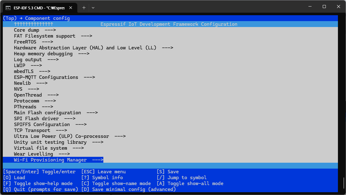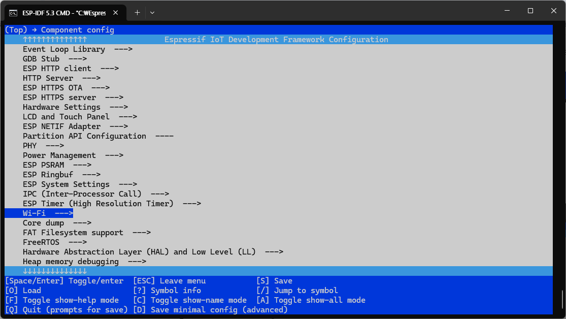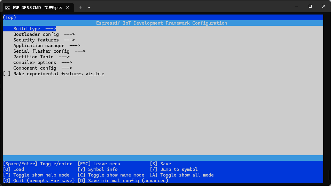 | C:\src\hello_world>idf.py menuconfig Executing action: menuconfig Running ninja in directory C:\src\hello_world\build Executing "ninja menuconfig"... [0/1] cmd.exe /C "cd /D C:\src\hello_world\build && C:\Esp...ERSION=5.3.1 --output config C:/src/hello_world/sdkconfig"C:/Espressif/frameworks/esp-idf-v5.3.1/Kconfig:15: warning: IDF_ENV_FPGA has 'option env="IDF_ENV_FPGA"', but the environment variable IDF_ENV_FPGA is not set Loaded configuration 'C:/src/hello_world/sdkconfig' No changes to save (for 'C:/src/hello_world/sdkconfig') |