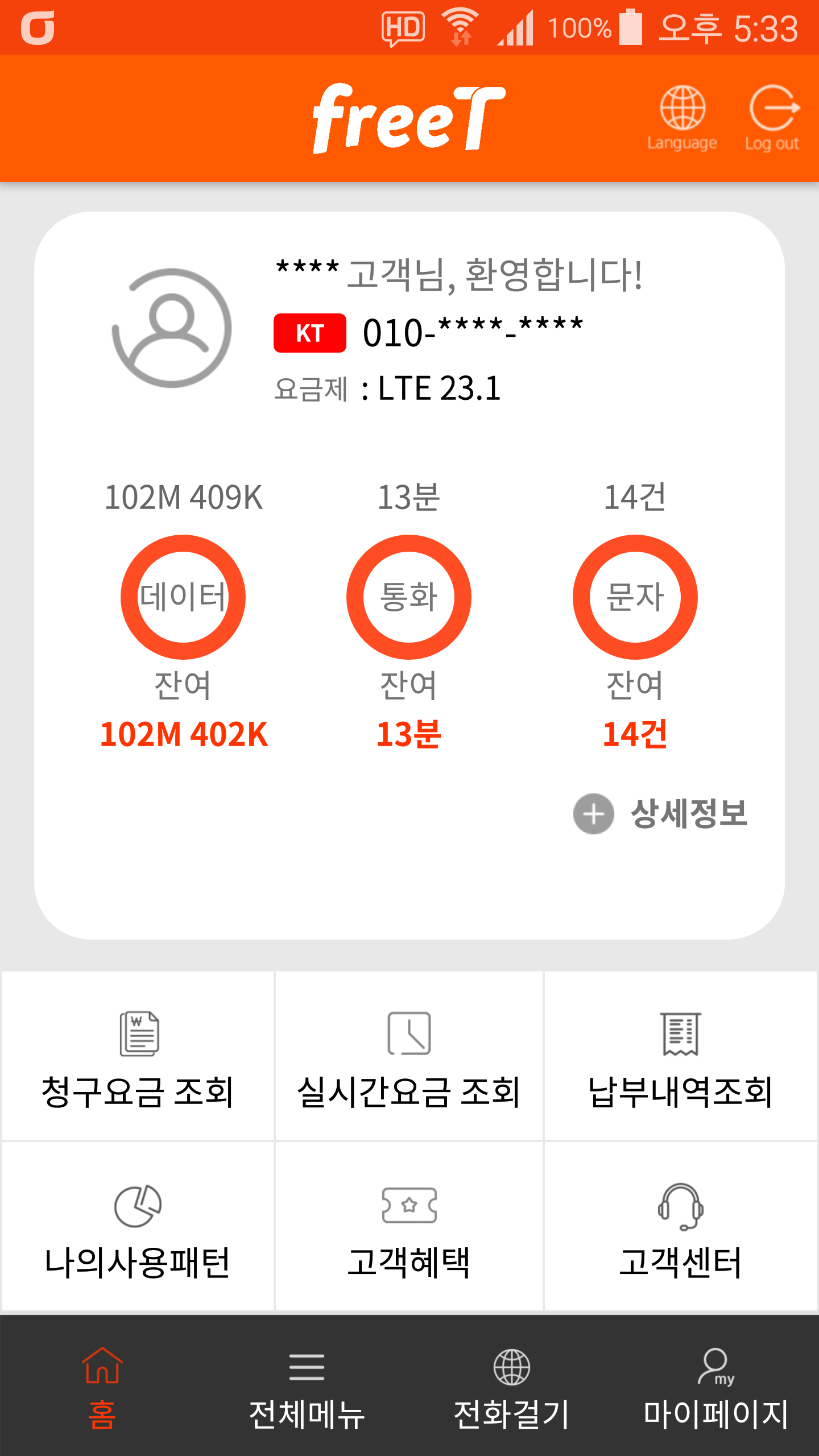 내일이 4월의 마지막 날이라 그런가 일할계산되서 "102M 402K / 13분 / 14건"을 쓸 수 있다.