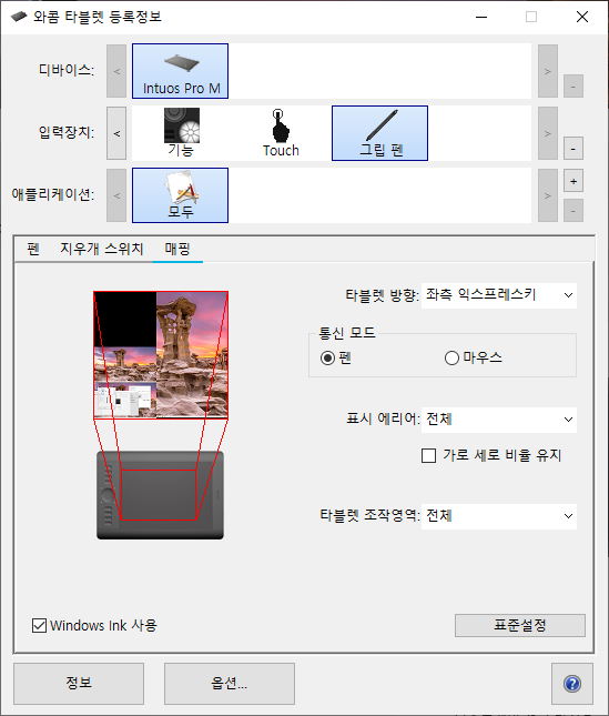 매핑에서 전체 화면에 대해서 어떤 방향으로 타블렛을 놓고 쓸지