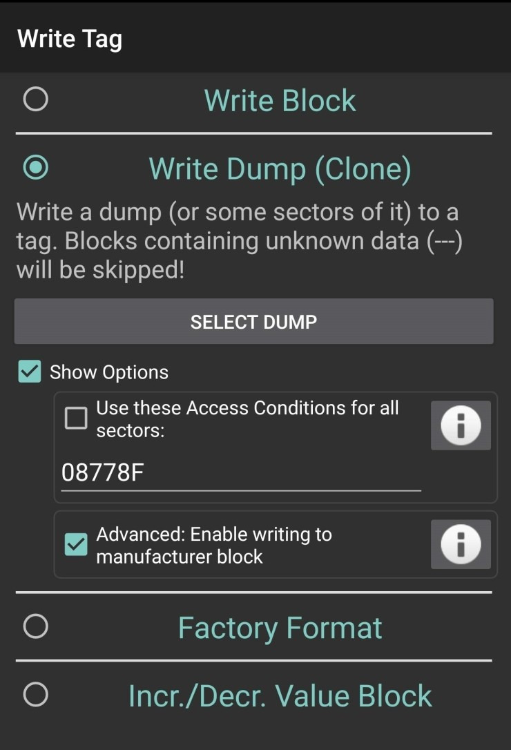 Write Tag / Write Dump (Clone) / Show Options - Advanced : Enable writing to manufacture block