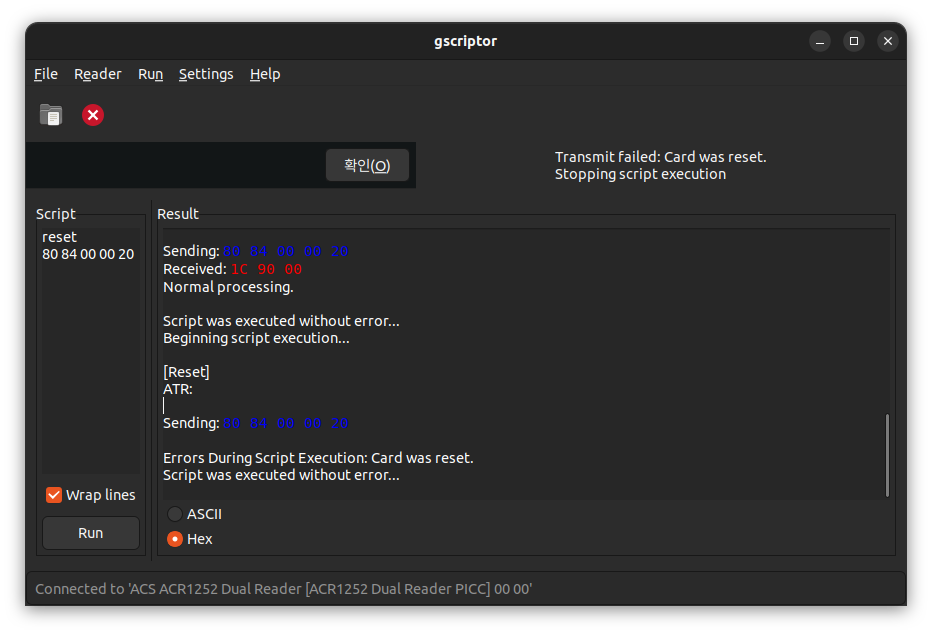 카드가 없으면 ATR 응답도 없고, 당연히(?) APDU(?) 에도 응답이 없어 에러가 발생한다.