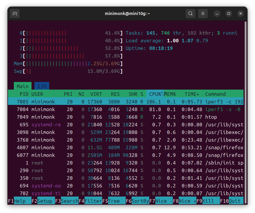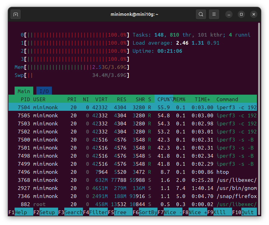 | $ iperf3 -s ----------------------------------------------------------- Server listening on 5201 (test #1) ----------------------------------------------------------- Accepted connection from 192.168.0.1, port 46302 [ 5] local 192.168.0.1 port 5201 connected to 192.168.0.1 port 46304 [ ID] Interval Transfer Bitrate [ 5] 0.00-1.00 sec 5.09 GBytes 43.7 Gbits/sec [ 5] 1.00-2.00 sec 4.58 GBytes 39.4 Gbits/sec [ 5] 2.00-3.00 sec 3.87 GBytes 33.2 Gbits/sec [ 5] 3.00-4.00 sec 4.58 GBytes 39.4 Gbits/sec [ 5] 4.00-5.00 sec 4.47 GBytes 38.4 Gbits/sec [ 5] 5.00-6.00 sec 4.80 GBytes 41.3 Gbits/sec [ 5] 6.00-7.00 sec 4.78 GBytes 41.0 Gbits/sec [ 5] 7.00-8.00 sec 3.46 GBytes 29.8 Gbits/sec [ 5] 8.00-9.00 sec 2.80 GBytes 24.1 Gbits/sec [ 5] 9.00-10.00 sec 3.33 GBytes 28.6 Gbits/sec [ 5] 10.00-10.00 sec 768 KBytes 23.8 Gbits/sec - - - - - - - - - - - - - - - - - - - - - - - - - [ ID] Interval Transfer Bitrate [ 5] 0.00-10.00 sec 41.8 GBytes 35.9 Gbits/sec receiver |