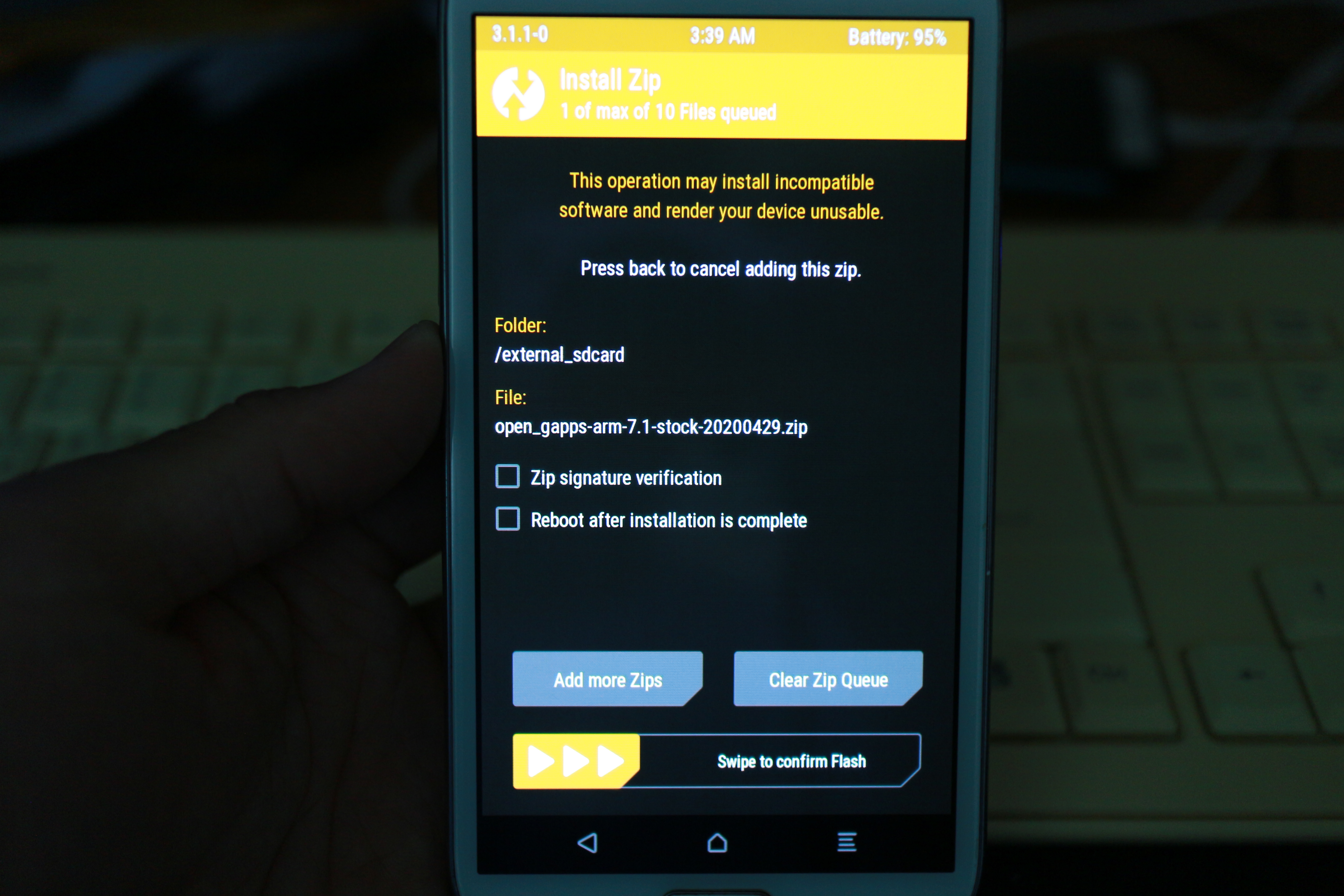 파일을 선택하고 나서 Swipe to confirm Flash를 누른다.