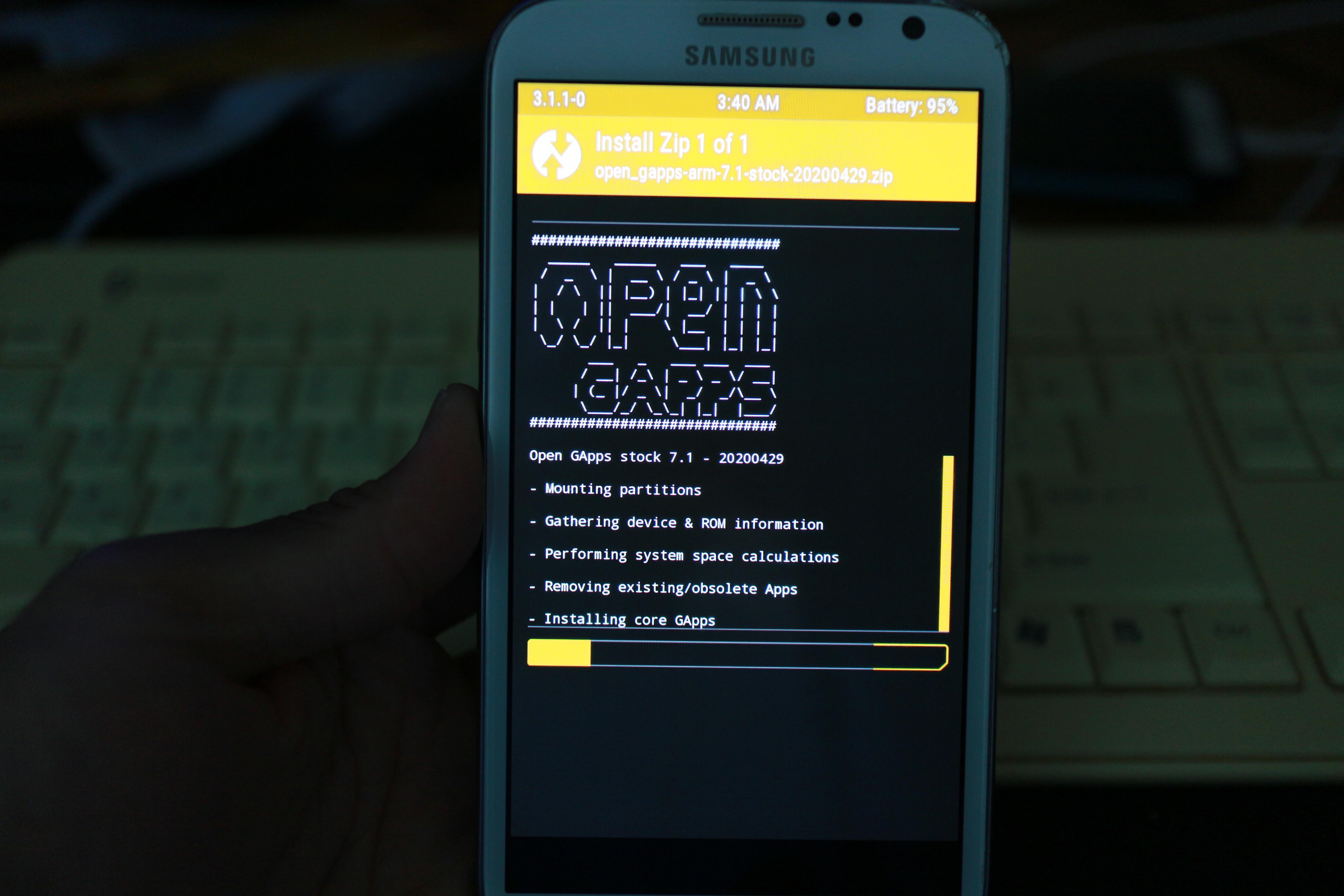 부팅전에 SD 메모리에 lineageOS image와 google apps를 넣어주었는데 그걸 고르면 된다.