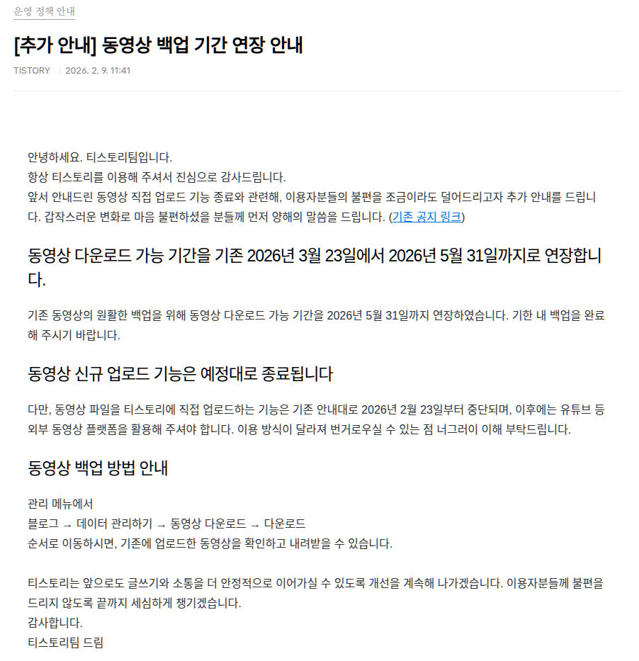 티스토리 동영상 관련 공지  (5) 2026.01.26