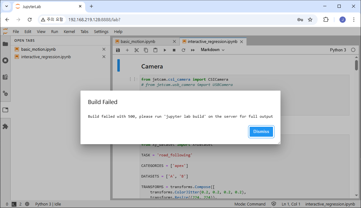 $ sudo jupyter lab build [sudo] password for jetson: /usr/lib/python3/dist-packages/requests/__init__.py:80: RequestsDependencyWarning: urllib3 (1.26.4) or chardet (3.0.4) doesn't match a supported version! RequestsDependencyWarning) [LabBuildApp] JupyterLab 2.2.6 [LabBuildApp] Building in /usr/local/share/jupyter/lab [LabBuildApp] Building jupyterlab assets (build:dev:minimize)