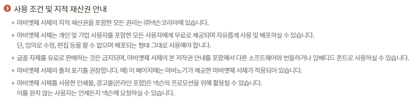 개인 및 기업 무료, 다른 소프트웨어와 번들하거나 임베디드 폰트로 사용가능