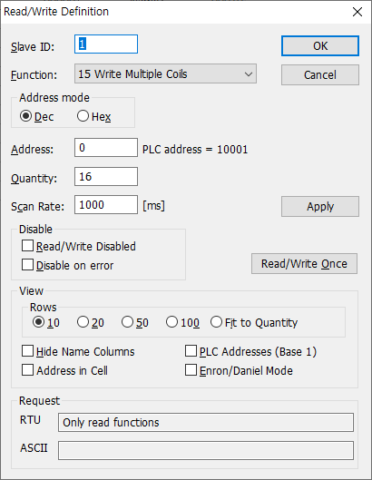 modbus poll에서 아래와 같이 coil 을 설정해서 해보니 DO에 불이 들어온다.