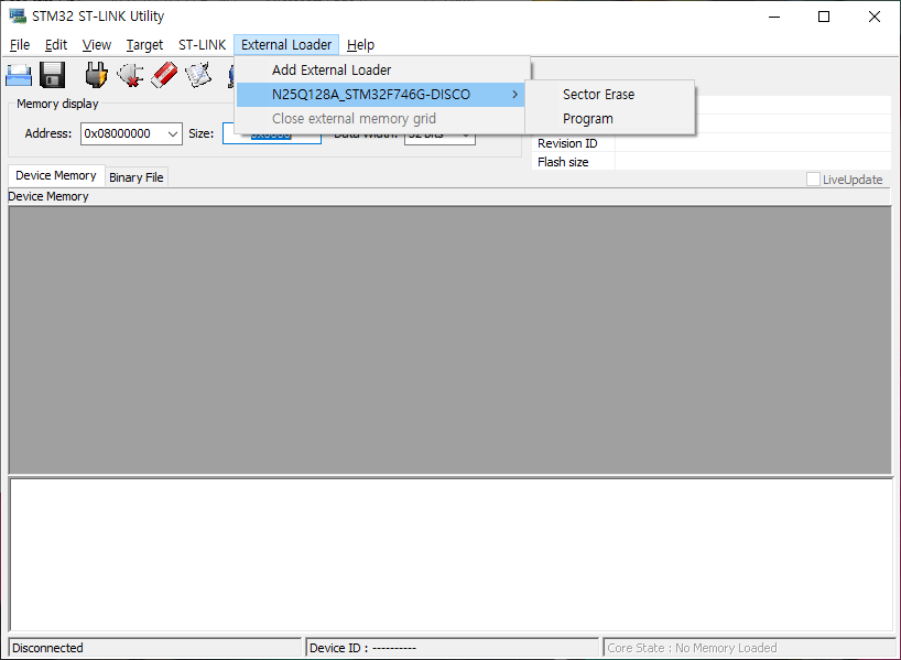 | 1.1 GDB server start-up options --ext-memory-loaders Provides the list of the available external memory loaders. -el <file_path>, --extload <file_path> Selects a custom external memory-loader. --external-init Runs Init() from external memory loader after reset to make external memory accessible without need for application software to set up the access to memory-mapped external memory. [This option requires that option -el <file_path>, --extload <file_path> is used also.] 2.3.1 Loading program to external memory When a program must be loaded to an external memory, the option --extload <file_path> must be used. External memory loader files are delivered for most available STM32 Evaluation and Discovery boards containing external memory. To list the available loader files, use the --ext-memory-loaders option. The STM32CubeProgrammer software description user manual (UM2237) contains detailed information on how to use external Flash loader programs and develop customized loaders for external memory. The user manual is available from the STM32CubeProg webpage on www.st.com. 2.3.2 Memory read/write to external memory To make external memory accessible for read and write by the debugger, use the --external-init option together with external memory loader --extload <file_path> option. When --external-init is used the Init() function in the external memory loader is run by the ST-LINK GDB server after reset. This makes external memory accessible without any need for application software to set up the device for external memory access. The external memory must be memory mapped and directly accessed because normal memory read/ write is used by gdb. Note: When using the --external-init option with the ST-LINK GDB server, the stack required by the Init() function is limited to 1024 bytes of stack instead of 400 bytes in ST-LINK GDB server v5.4.0. |
