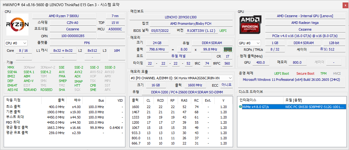온보드는 8GB고 메모리는 16GB SK 하이닉스 DDR4-3200이 달려있다.