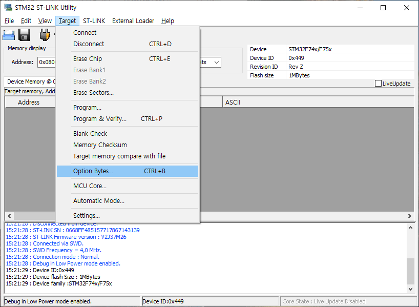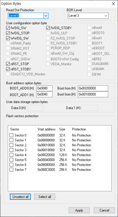 왼쪽 세번째 아이콘 OB가 Option Bytes 인데