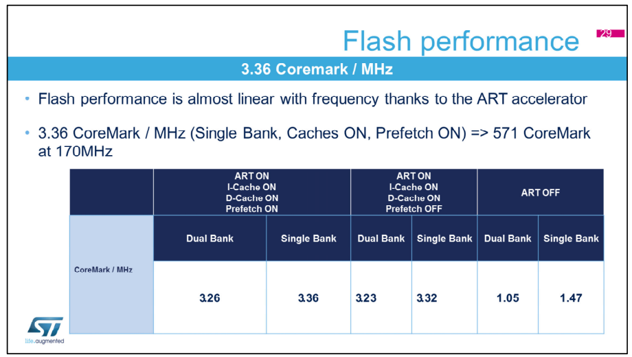 | 3.1 Firmware tips and tricks 3.1.1 Common firmware configuration ART configuration The ART Accelerator™ is a memory accelerator which is optimized for STM32 ARM® Cortex™-Mx processors. It balances the inherent performance advantage of the ARM Cortex-Mx over Flash memory technologies, which normally requires the processor to wait for the Flash memory at higher operating frequencies. Thanks to the ART Accelerator™, the CPU can operate up to 120 MHz without wait states, thereby increasing the overall system speed and efficiency. To release the full processor 150 DMIPS performance at this frequency, the accelerator implements an instruction prefetch queue and instruction/data, which enables program execution from Flash memory at up to 120 MHz without wait states. To avoid extra power consumption it is recommended to configure the ART as follows: /* Disable prefetch buffer */ FLASH->ACR & = ~FLASH_ACR_PRFTEN; /* Enable flash instruction cache */ FLASH->ACR |= FLASH_ACR_ICEN; /* Enable flash data cache */ FLASH->ACR |= FLASH_ACR_DCEN; The system performance can be adjusted to the current needs. This can be done either from start, according to performance estimations, or on-the-fly on a running system to adjust the performance to the current condition. In this way the prefetch can be enabled or disabled on-the-fly depending on user needs. Disabling the prefetch buffer avoids extra Flash access that consumes 20 mA for 128-bit line fetching. |