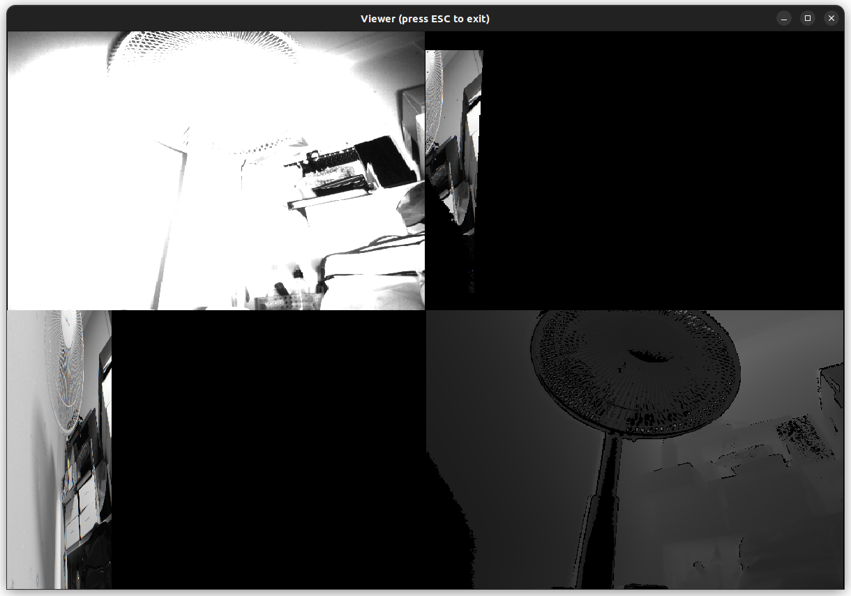 | libfreenect2/build/bin$ ./Protonect Version: 0.2.0 Environment variables: LOGFILE=<protonect.log> Usage: ./Protonect [-gpu=<id>] [gl | cl | clkde | cuda | cudakde | cpu] [<device serial>] [-noviewer] [-norgb | -nodepth] [-help] [-version] [-frames <number of frames to process>] To pause and unpause: pkill -USR1 Protonect [Info] [Freenect2Impl] enumerating devices... [Info] [Freenect2Impl] 8 usb devices connected [Info] [Freenect2Impl] found valid Kinect v2 @2:4 with serial 501441643042 [Info] [Freenect2Impl] found 1 devices libva info: VA-API version 1.14.0 libva info: Trying to open /usr/lib/x86_64-linux-gnu/dri/iHD_drv_video.so libva info: Found init function __vaDriverInit_1_14 libva info: va_openDriver() returns 0 [Info] [VaapiRgbPacketProcessorImpl] driver: Intel iHD driver for Intel(R) Gen Graphics - 22.3.1 () [Info] [Freenect2DeviceImpl] opening... [Info] [Freenect2DeviceImpl] transfer pool sizes rgb: 20*16384 ir: 60*8*33792 [Info] [Freenect2DeviceImpl] opened [Info] [Freenect2DeviceImpl] starting... [Debug] [Freenect2DeviceImpl] status 0x090000: 9729 [Debug] [Freenect2DeviceImpl] status 0x090000: 9731 [Info] [Freenect2DeviceImpl] submitting rgb transfers... [Info] [Freenect2DeviceImpl] submitting depth transfers... [Debug] [DepthPacketStreamParser] not all subsequences received 0 [Info] [Freenect2DeviceImpl] started device serial: 501441643042 device firmware: 4.0.3911.0 [Debug] [DepthPacketStreamParser] not all subsequences received 960 [Debug] [DepthPacketStreamParser] not all subsequences received 1007 [Info] [DepthPacketStreamParser] 1 packets were lost [Debug] [DepthPacketStreamParser] not all subsequences received 1022 [Debug] [DepthPacketStreamParser] not all subsequences received 511 [Debug] [DepthPacketStreamParser] not all subsequences received 1019 [Info] [DepthPacketStreamParser] 3 packets were lost [Debug] [DepthPacketStreamParser] not all subsequences received 1015 [Debug] [DepthPacketStreamParser] not all subsequences received 1015 [Debug] [DepthPacketStreamParser] not all subsequences received 1019 [Info] [DepthPacketStreamParser] 3 packets were lost [Info] [OpenGLDepthPacketProcessor] avg. time: 7.41895ms -> ~134.79Hz [Info] [VaapiRgbPacketProcessor] avg. time: 3.69809ms -> ~270.41Hz [Debug] [DepthPacketStreamParser] not all subsequences received 1015 [Info] [DepthPacketStreamParser] 1 packets were lost [Info] [OpenGLDepthPacketProcessor] avg. time: 7.03777ms -> ~142.091Hz [Info] [VaapiRgbPacketProcessor] avg. time: 3.92516ms -> ~254.767Hz [Debug] [DepthPacketStreamParser] not all subsequences received 1022 [Debug] [DepthPacketStreamParser] not all subsequences received 1019 [Debug] [DepthPacketStreamParser] not all subsequences received 1022 [Debug] [DepthPacketStreamParser] not all subsequences received 1022 [Debug] [DepthPacketStreamParser] not all subsequences received 991 [Debug] [DepthPacketStreamParser] not all subsequences received 1022 [Debug] [DepthPacketStreamParser] not all subsequences received 987 [Info] [DepthPacketStreamParser] 7 packets were lost [Debug] [DepthPacketStreamParser] not all subsequences received 511 [Debug] [DepthPacketStreamParser] not all subsequences received 511 [Debug] [DepthPacketStreamParser] not all subsequences received 991 [Debug] [DepthPacketStreamParser] not all subsequences received 511 [Debug] [DepthPacketStreamParser] not all subsequences received 1022 [Debug] [DepthPacketStreamParser] not all subsequences received 1019 [Debug] [DepthPacketStreamParser] not all subsequences received 767 [Debug] [DepthPacketStreamParser] not all subsequences received 991 [Debug] [DepthPacketStreamParser] not all subsequences received 1019 [Info] [DepthPacketStreamParser] 9 packets were lost [Debug] [DepthPacketStreamParser] not all subsequences received 1022 [Debug] [DepthPacketStreamParser] not all subsequences received 1022 [Debug] [DepthPacketStreamParser] not all subsequences received 971 [Debug] [DepthPacketStreamParser] not all subsequences received 511 [Debug] [DepthPacketStreamParser] not all subsequences received 511 [Debug] [DepthPacketStreamParser] not all subsequences received 1022 [Info] [VaapiRgbPacketProcessor] avg. time: 4.29916ms -> ~232.603Hz [Debug] [DepthPacketStreamParser] not all subsequences received 1019 [Debug] [DepthPacketStreamParser] not all subsequences received 511 [Debug] [DepthPacketStreamParser] not all subsequences received 511 [Info] [DepthPacketStreamParser] 9 packets were lost [Debug] [DepthPacketStreamParser] not all subsequences received 1022 [Debug] [DepthPacketStreamParser] not all subsequences received 1022 [Debug] [DepthPacketStreamParser] not all subsequences received 987 [Info] [OpenGLDepthPacketProcessor] avg. time: 7.66351ms -> ~130.489Hz [Debug] [DepthPacketStreamParser] not all subsequences received 511 [Debug] [DepthPacketStreamParser] not all subsequences received 1022 [Debug] [DepthPacketStreamParser] not all subsequences received 1019 [Debug] [DepthPacketStreamParser] not all subsequences received 511 [Debug] [DepthPacketStreamParser] not all subsequences received 511 [Debug] [DepthPacketStreamParser] not all subsequences received 511 [Info] [DepthPacketStreamParser] 9 packets were lost [Debug] [DepthPacketStreamParser] not all subsequences received 1022 [Debug] [DepthPacketStreamParser] not all subsequences received 1019 [Info] [DepthPacketStreamParser] 2 packets were lost [Debug] [DepthPacketStreamParser] not all subsequences received 1022 [Debug] [DepthPacketStreamParser] not all subsequences received 1007 [Info] [VaapiRgbPacketProcessor] avg. time: 4.41688ms -> ~226.404Hz [Info] [DepthPacketStreamParser] 2 packets were lost [Debug] [DepthPacketStreamParser] not all subsequences received 1022 [Debug] [DepthPacketStreamParser] not all subsequences received 1019 [Info] [DepthPacketStreamParser] 2 packets were lost [Debug] [DepthPacketStreamParser] not all subsequences received 1022 [Info] [OpenGLDepthPacketProcessor] avg. time: 6.63554ms -> ~150.704Hz [Debug] [DepthPacketStreamPar