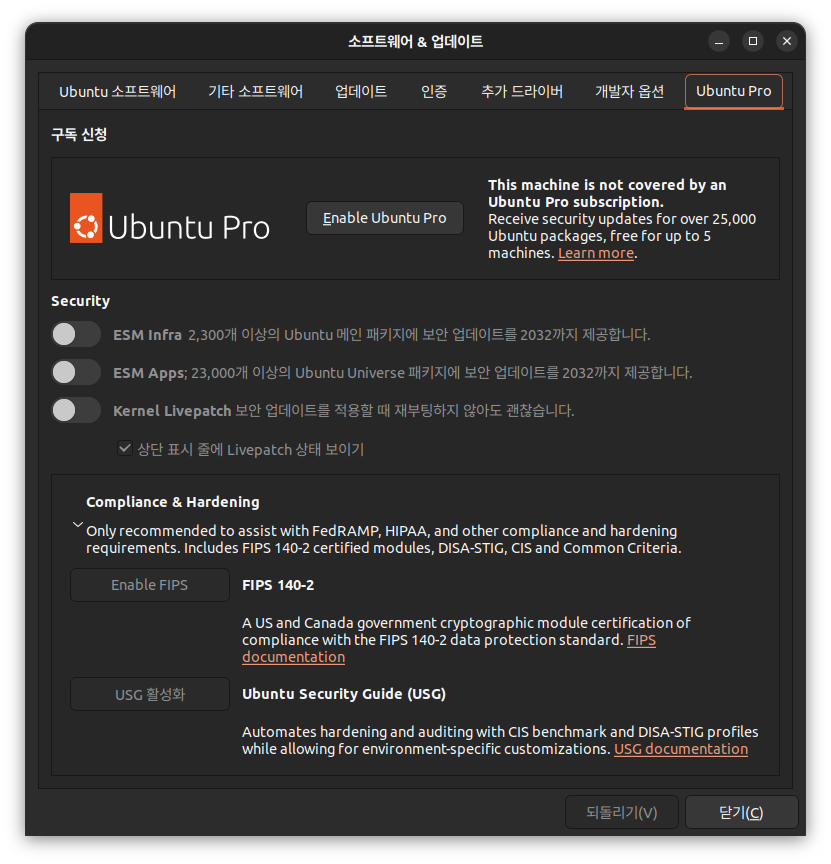 설정 누르니 소프트웨어 & 업데이트에서 Ubuntu Pro가 추가되었는데..