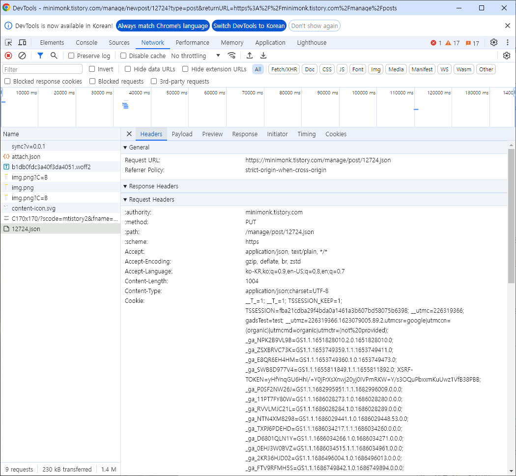 해당 PUT /manage/post/article_id.json에 대한 응답만 처리가 안되어서
