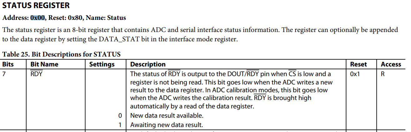 | \CONFIGURATION OVERVIEW After power-on or reset, the AD4111 default configuration is as follows: • Channel configuration: Channel 0 is enabled, the VIN0 and VIN1 pair is selected as the input. Setup 0 is selected. • Setup configuration: the analog input buffers are disabled and the reference input buffers are also disabled. The REF± pins are selected as the reference source. Note that for this setup, the default channel does not operate correctly because the input buffers need to be enabled for a VIN input. • Filter configuration: the sinc5 + sinc1 filter is selected and the maximum output data rate of 31.25 kSPS is selected. • ADC mode: continuous conversion mode and the internal oscillator are enabled. The internal reference is disabled. • Interface mode: CRC and the data and status output are disabled. • GPIO configuration: open wire detection is disabled. Note that only a few of the register setting options are shown. This list is only an example. For full register information, see the Register Details section. Figure 35 shows an overview of the suggested flow for changing the ADC configuration, divided into the following three blocks: • Channel configuration (see Box A in Figure 35) • Setup configuration (see Box B in Figure 35) • ADC mode and interface mode configuration (see Box C in Figure 35) ![]() SPI의 MISO핀이 RDY라서 어떻게 읽나 했는데 상태 레지스터에서 RDY를 보면 된다. ![]() CONTINUOUS CONVERSION MODE Continuous conversion mode is the default power-up mode. The AD4111 converts continuously, and the RDY bit in the status register goes low each time a conversion is complete. If CS is low, the RDY output also goes low when a conversion is complete SINGLE CONVERSION MODE In single conversion mode, the AD4111 performs a single conversion and is placed in standby mode after the conversion is complete. The RDY output goes low to indicate the completion of a conversion. When the data-word has been read from the data register, the RDY output goes high. The data register can be read several times, if required, even when the RDY output goes high. If several channels are enabled, the ADC automatically sequences through the enabled channels and performs a conversion on each channel. When the first conversion is started, the RDY output goes high and remains high until a valid conversion is available and CS is low. When the conversion is available, the RDY output goes low. The ADC then selects the next channel and begins a conversion. The user can read the present conversion while the next conversion is being performed. When the next conversion is complete, the data register is updated; therefore, the user has a limited period in which to read the conversion. When the ADC has performed a single conversion on each of the selected channels, it returns to standby mode. If the DATA_STAT bit in the interface mode register is set to 1, the contents of the status register, along with the conversion, are output each time the data register is read. The four LSBs of the status register indicate the channel to which the conversion corresponds. ![]() ![]() |