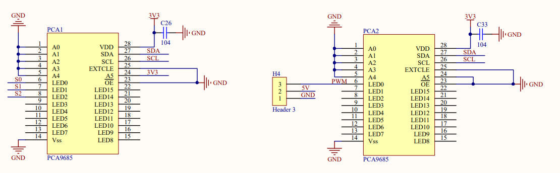 PCA9685 * 2 PCA1 - 3V3(0x60) 모터 구동 / PCA2 - GND(0x40) 서보 구동