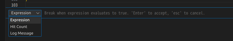 [링크 : https://stackoverflow.com/questions/43311058/vscode-debugger-conditional-breakpoints]