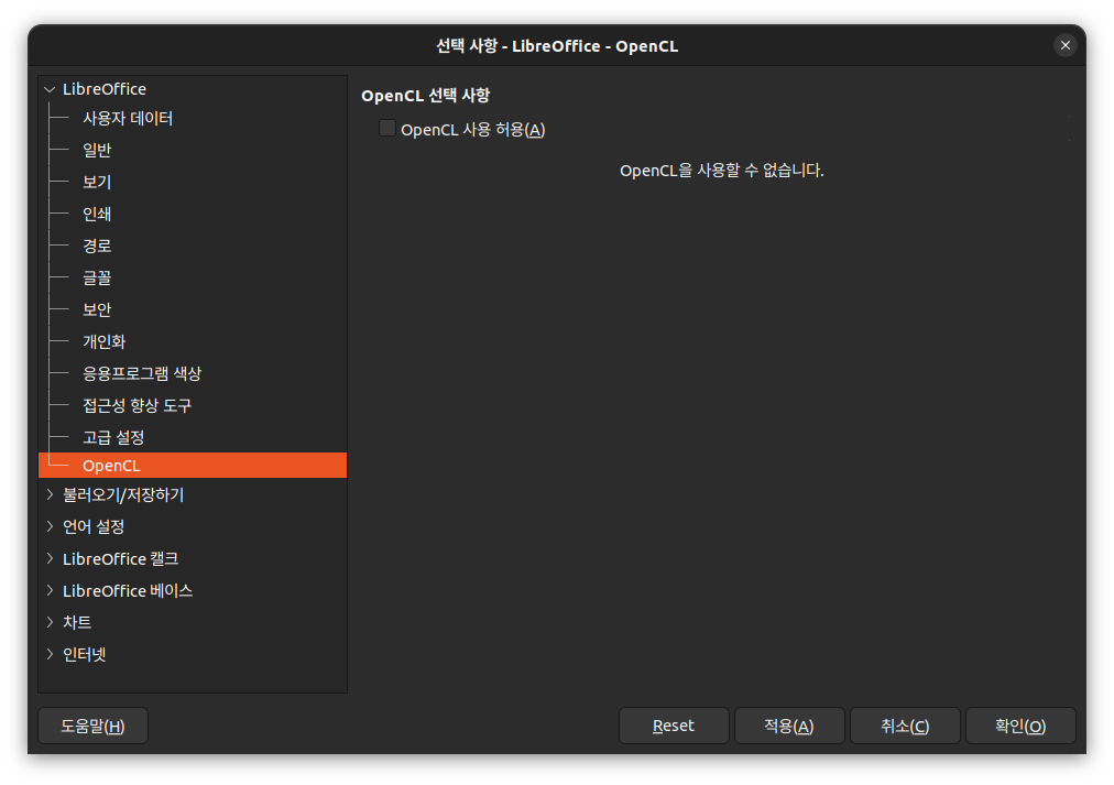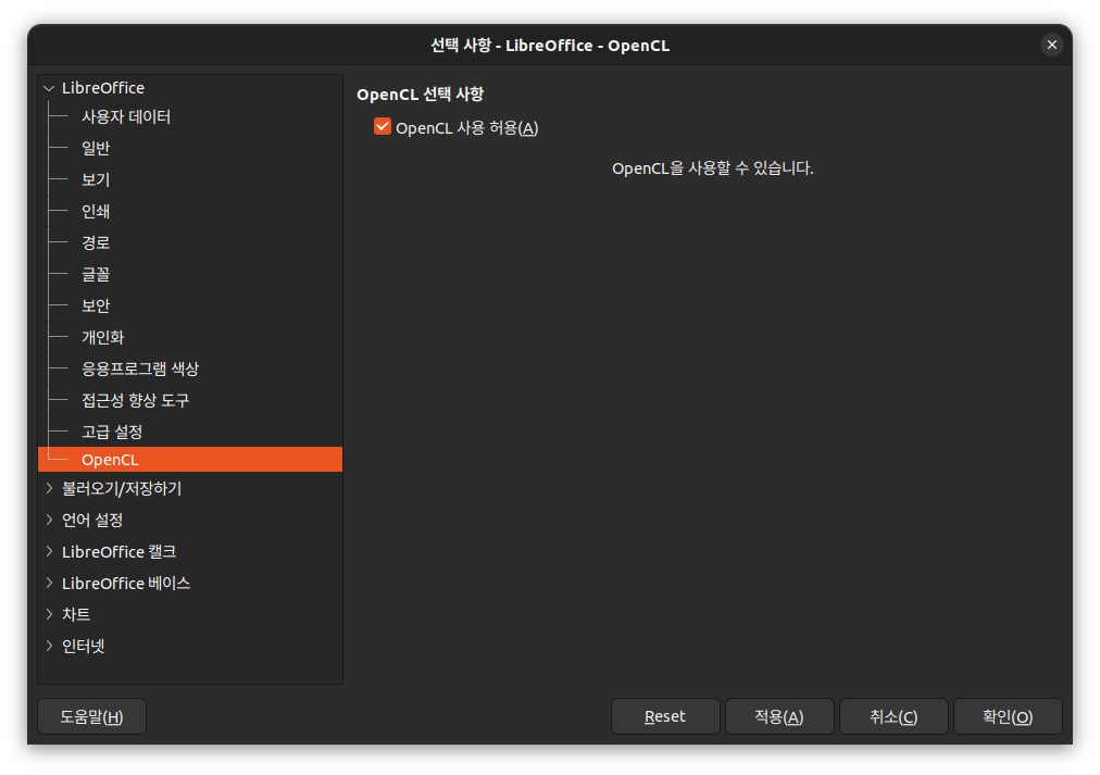[링크 : https://ask.libreoffice.org/t/unable-to-activate-opencl/45714/3]