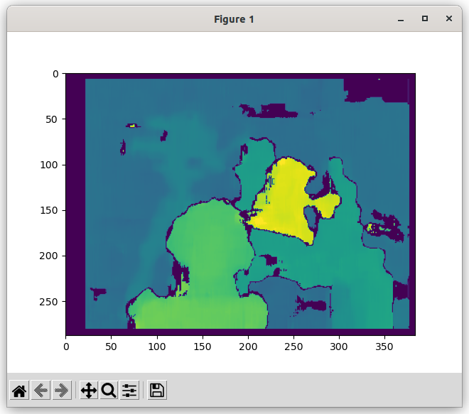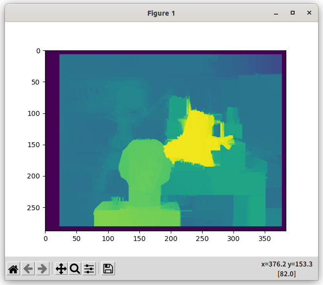 | $ cat depth.py import numpy as np import cv2 as cv from matplotlib import pyplot as plt imgL = cv.imread('tsukuba_l.png', cv.IMREAD_GRAYSCALE) imgR = cv.imread('tsukuba_r.png', cv.IMREAD_GRAYSCALE) max_disparity=16 stereo = cv.StereoBM_create(max_disparity, blockSize=15) disparity = stereo.compute(imgL,imgR) plt.imshow(disparity) plt.show() right_matcher = cv.ximgproc.createRightMatcher(stereo); left_disp = stereo.compute(imgL, imgR); right_disp = right_matcher.compute(imgR, imgL); # Now create DisparityWLSFilter wls_filter = cv.ximgproc.createDisparityWLSFilter(stereo); sigma = 1.5 lmbda = 8000.0 wls_filter.setLambda(lmbda); wls_filter.setSigmaColor(sigma); filtered_disp = wls_filter.filter(left_disp, imgL, disparity_map_right=right_disp); plt.imshow(filtered_disp) plt.show() |
