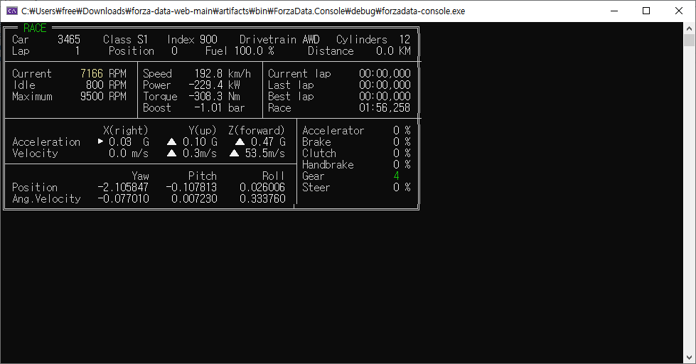 | 01 00 00 00 // S32 IsRaceOn; 87 65 A8 14 // U32 TimestampMS; FB 6F 14 46 // F32 EngineMaxRpm; F8 FF 47 44 // F32 EngineIdleRpm; D9 18 0A 45 // F32 CurrentEngineRpm; C0 FC 1B BD // F32 AccelerationX; 90 AB 60 3D 6C 00 D9 40 88 EA A9 BD // F32 VelocityX; E8 EF 9D BC 83 62 9B 40 5D F5 9C 3B // F32 AngularVelocityX; 16 7C 65 BC E9 09 D0 BC 7E D0 B0 BF // F32 Yaw; F2 E8 B1 BE AA F7 69 3E FA 31 DB 3E // F32 NormalizedSuspensionTravelFrontLeft CE 72 B3 3E A4 DD F8 3E 3F 6E 03 3F FB 1B 71 3F // F32 TireSlipRatioFrontLeft 07 85 59 3F A2 BE 10 3F 4F 86 29 3F 39 74 A3 41 // F32 WheelRotationSpeedFrontLeft CC 09 8C 41 BC CC 81 41 C2 F8 85 41 00 00 00 00 // S32 WheelOnRumbleStripFrontLeft 00 00 00 00 00 00 00 00 00 00 00 00 00 00 00 00 // F32 WheelInPuddleDepthFrontLeft 00 00 00 00 00 00 00 00 00 00 00 00 99 99 19 3F // F32 SurfaceRumbleFrontLeft 99 99 19 3F 99 99 19 3F 99 99 19 3F 34 3F DD 3D // F32 TireSlipAngleFrontLeft 34 C6 E3 3D 0F 9A 97 3D 35 FA 99 3D B2 B0 72 3F // F32 TireCombinedSlipFrontLeft 06 60 5B 3F DA FA 11 3F 20 9D 2A 3F 1E A2 B0 BB // F32 SuspensionTravelMetersFrontLeft 5C 44 3D BC 00 E9 9A 3A 80 C3 54 3B 89 0D 00 00 // S32 CarOrdinal 04 00 00 00 // S32 CarClass 84 03 00 00 // S32 CarPerformanceIndex 02 00 00 00 // S32 DrivetrainType - // 0 = FWD, 1 = RWD, 2 = AWD 0C 00 00 00 // S32 NumCylinders 0D 00 00 00 // ?? 00 00 00 00 // ?? 00 00 00 00 // ?? EC C6 18 C4 // F32 PositionX; 33 08 20 43 // F32 PositionY; 40 A0 1C C5 // F32 PositionZ; A1 68 9B 40 // F32 Speed; F4 5F 03 48 // F32 Power; 23 DF 11 44 // F32 Torque; 20 4C 9C 42 // F32 TireTempFrontLeft; 0D 43 9D 42 // F32 TireTempFrontRight; 9B FD A9 42 // F32 TireTempRearLeft; 9B FD A9 42 // F32 TireTempRearRight; 00 00 00 00 // F32 Boost; 00 00 80 3F // F32 Fuel; 00 00 00 00 // F32 DistanceTraveled; 00 00 00 00 // F32 BestLap; 00 00 00 00 // F32 LastLap; 00 00 00 00 // F32 CurrentLap; C8 AF FB 43 // F32 CurrentRaceTime; 00 00 // U16 LapNumber; 00 // U8 RacePosition; FF // U8 Accel; 00 // U8 Brake; 00 // U8 Clutch; 00 // U8 HandBrake; 01 // U8 Gear; 00 // S8 Steer; 00 // S8 NormalizedDrivingLine; 00 // S8 NormalizedAIBrakeDifference; 00 // ??? |