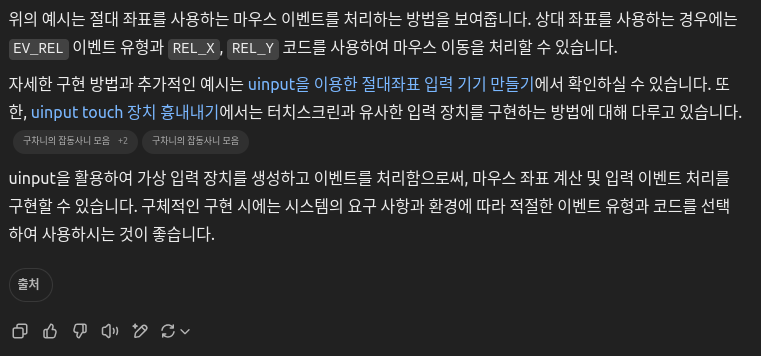 | 자세한 구현 방법과 추가적인 예시는 uinput을 이용한 절대좌표 입력 기기 만들기에서 확인하실 수 있습니다. 또한, uinput touch 장치 흉내내기에서는 터치스크린과 유사한 입력 장치를 구현하는 방법에 대해 다루고 있습니다. |