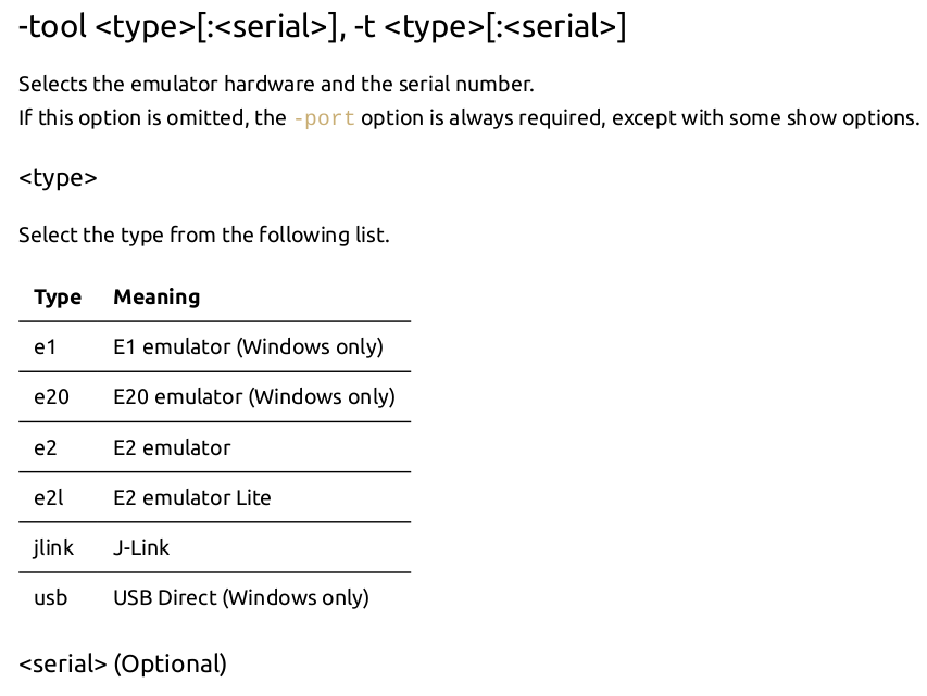 -erase, -e Erases flash memory of the device. -program, -p Erases the range for writing to the device and writes to the device. -erase-chip Erases all data in the flash memory of the device and clears the configuration settings. |