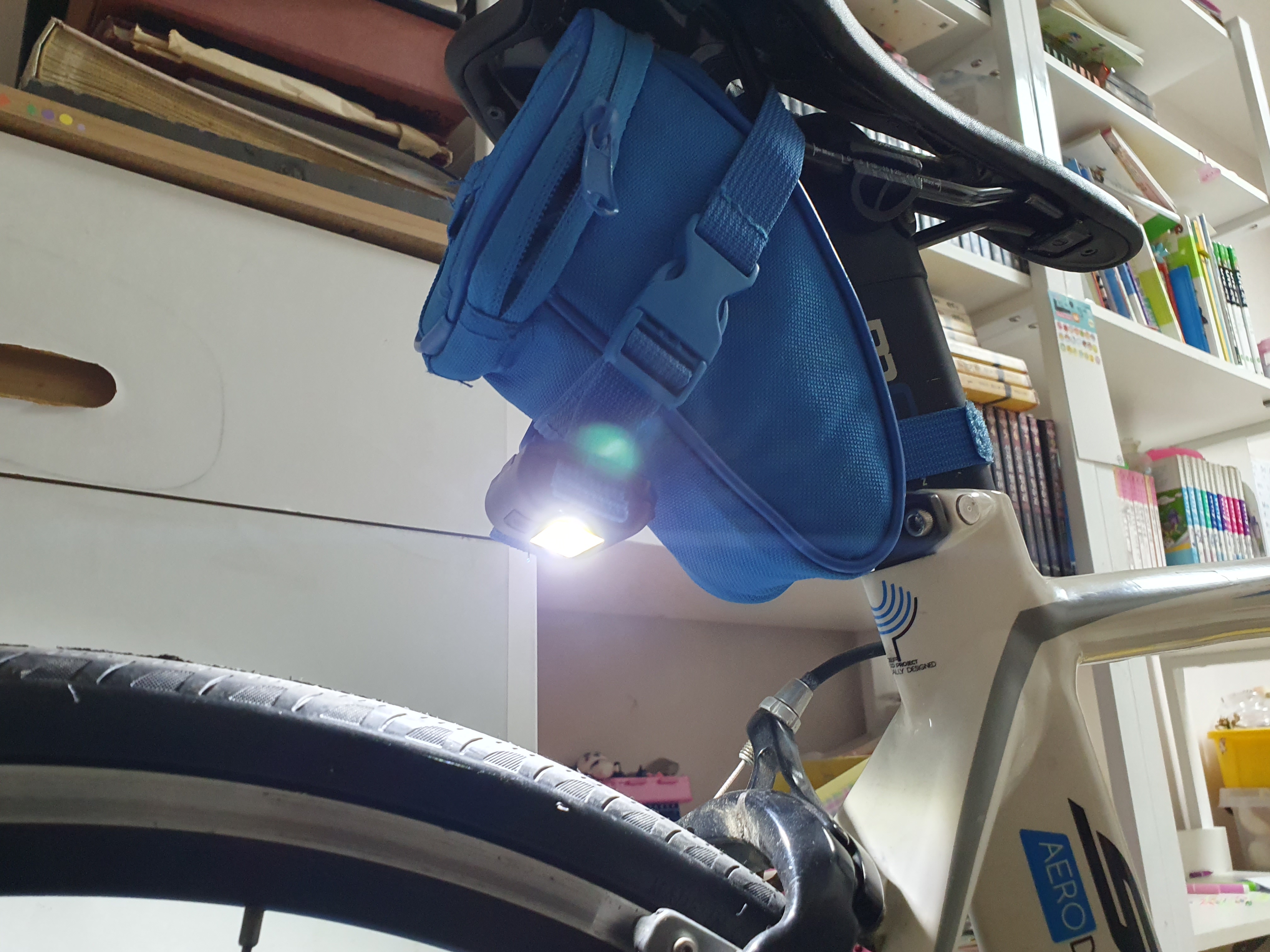 이전에 다이소에서 구매한 라이트를 대충 가방끈에 끼워보니