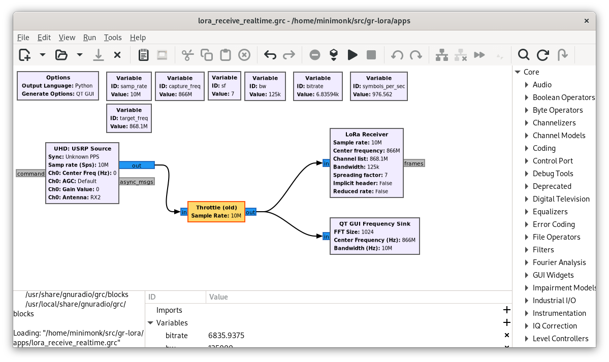 | <<< Welcome to GNU Radio Companion 3.10.9.2 >>> Block paths: /usr/share/gnuradio/grc/blocks /usr/local/share/gnuradio/grc/blocks Loading: "/home/minimonk/src/gr-lora/apps/lora_receive_realtime.grc" >>> Done Generating: "/home/minimonk/src/gr-lora/apps/lora_receive_realtime.py" >>> Warning: This flow graph contains a throttle block and another rate limiting block, e.g. a hardware source or sink. This is usually undesired. Consider removing the throttle block. >>> Warning: The block 'blocks_throttle_0' is deprecated. Executing: /usr/bin/python3 -u /home/minimonk/src/gr-lora/apps/lora_receive_realtime.py qt.qpa.plugin: Could not find the Qt platform plugin "wayland" in "" [INFO] [UHD] linux; GNU C++ version 13.2.0; Boost_108300; UHD_4.6.0.0+ds1-5.1ubuntu0.24.04.1 Traceback (most recent call last): File "/home/minimonk/src/gr-lora/apps/lora_receive_realtime.py", line 234, in <module> main() File "/home/minimonk/src/gr-lora/apps/lora_receive_realtime.py", line 212, in main tb = top_block_cls() ^^^^^^^^^^^^^^^ File "/home/minimonk/src/gr-lora/apps/lora_receive_realtime.py", line 77, in __init__ self.uhd_usrp_source_0 = uhd.usrp_source( ^^^^^^^^^^^^^^^^ RuntimeError: LookupError: KeyError: No devices found for -----> Empty Device Address >>> Done (return code 1) |